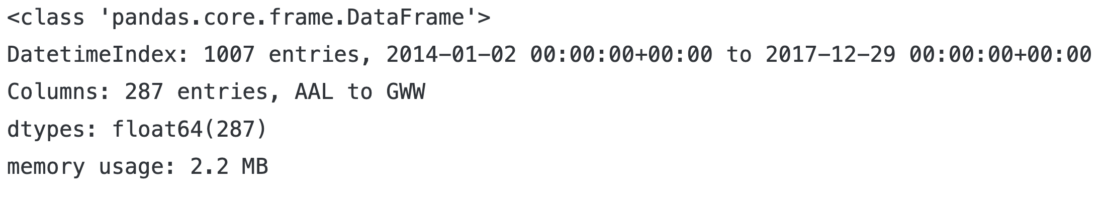 MultiIndex: 73812 entries, (Timestamp('2014-12-09 00:00:00+0000', tz='UTC'), 'AAL') to (Timestamp('2017-11-29 00:00:00+0000', tz='UTC'), 'XOM')