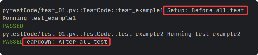 class TestCode:def setup_class(self):print("Setup: Before all test")def teardown_class(self):print("Teardown: After all test")def test_example1(self):print("Running test_example1")def test_example2(self):print("Running test_example2")