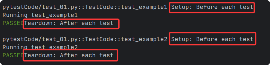 class TestCode:def setup_method(self):print("Setup: Before each test")def teardown_method(self):print("Teardown: After each test")def test_example1(self):print("Running test_example1")def test_example2(self):print("Running test_example2")