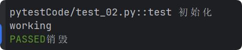 执行步骤为,pytest命令使用后,先调用test方法中的init_destroy方法,然后执行到yield返回打印working,测试完成,返回到yield的位置,继续往后执行
