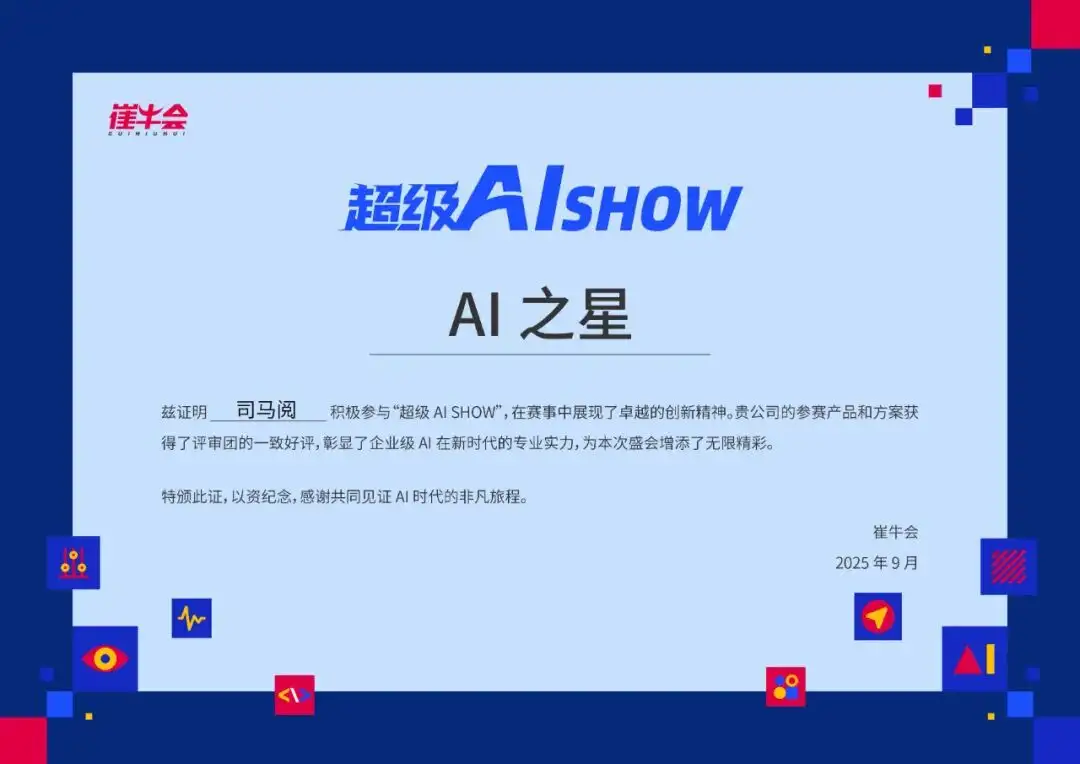 近日,由崔牛会主办的2025超级AIShow终极秀在深圳圆满落幕。司马阅凭借深厚的技术积累与场景化创新,司马阅企业AI文档智能体平台赢得评审青睐,从百余个优秀项目中脱颖而出,荣获“AI之星”荣誉,展现了司马阅在企业AI落地上的独特优势,也凸显了司马阅推动产业升级的长期价值。