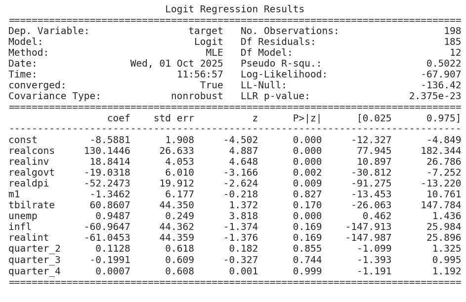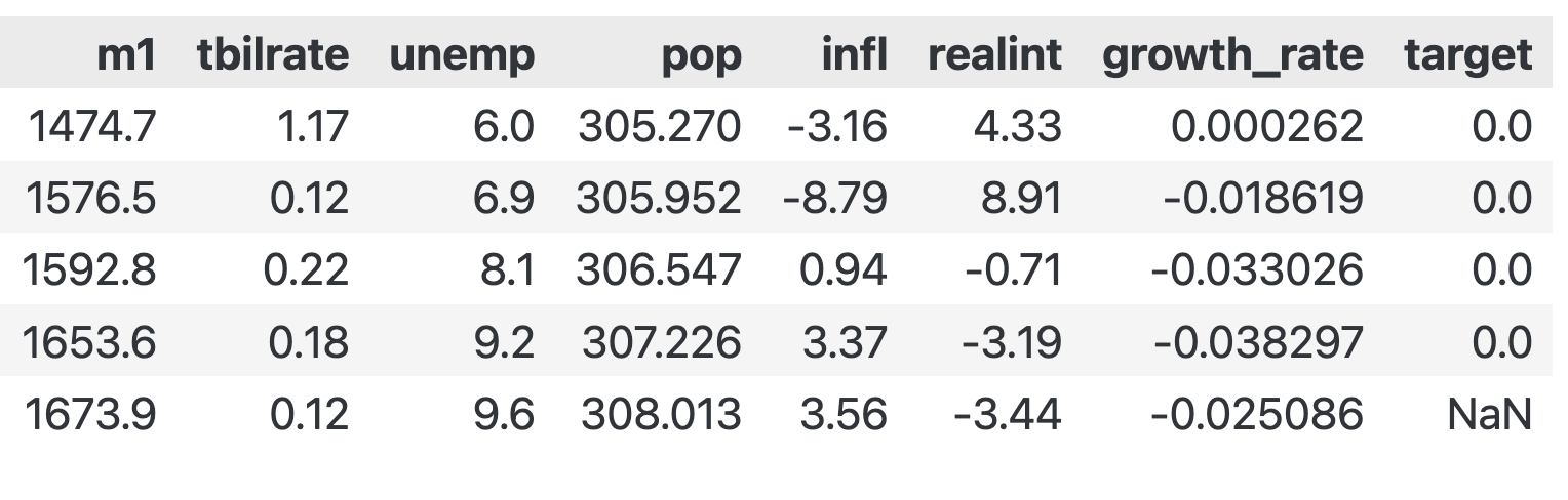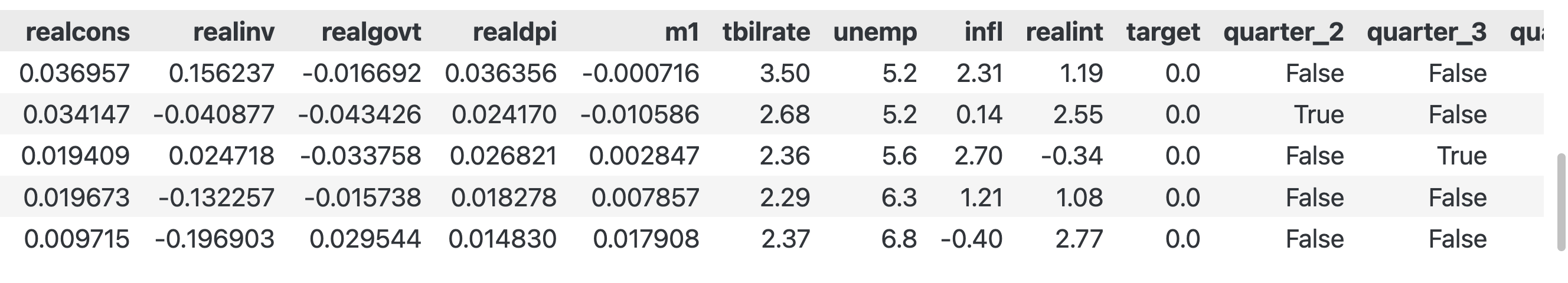 --- ------ -------------- ----- 0 realcons 198 non-null float641 realinv 198 non-null float642 realgovt 198 non-null float643 realdpi 198 non-null float644 m1 198 non-null float645 tbilrate 198 non-null float646 unemp 198 non-null float647 infl 198 non-null float648 realint 198 non-null float649 target 198 non-null float6410 quarter_2 198 non-null bool 11 quarter_3 198 non-null bool 12 quarter_4 198 non-null bool