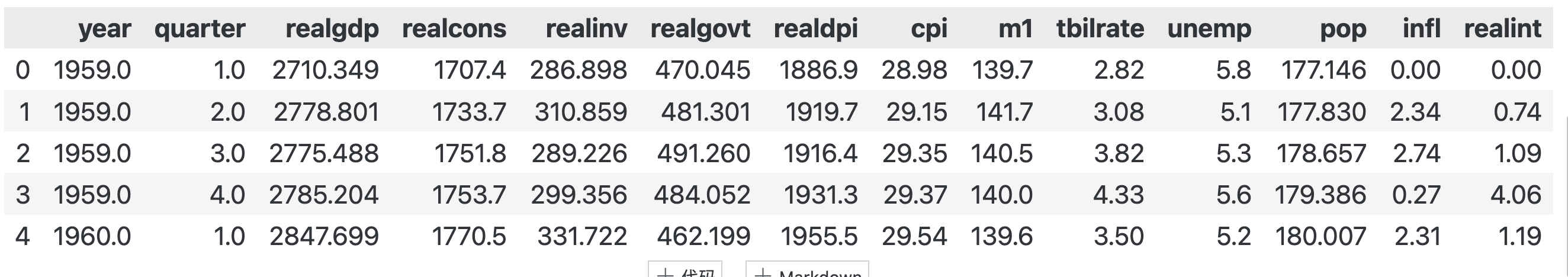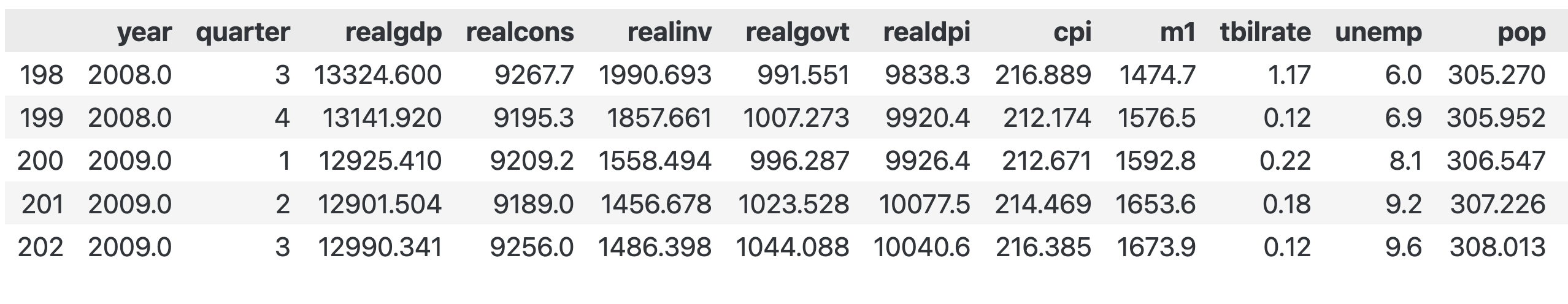 --- ------ -------------- ----- 0 year 203 non-null float641 quarter 203 non-null float642 realgdp 203 non-null float643 realcons 203 non-null float644 realinv 203 non-null float645 realgovt 203 non-null float646 realdpi 203 non-null float647 cpi 203 non-null float648 m1 203 non-null float649 tbilrate 203 non-null float6410 unemp 203 non-null float6411 pop 203 non-null float6412 infl 203 non-null float6413 realint 203 non-null float64