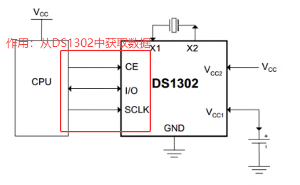 CE 为芯片使能:作用为控制从DS1302中获取数据,给以0获取不了,给1有可能获取