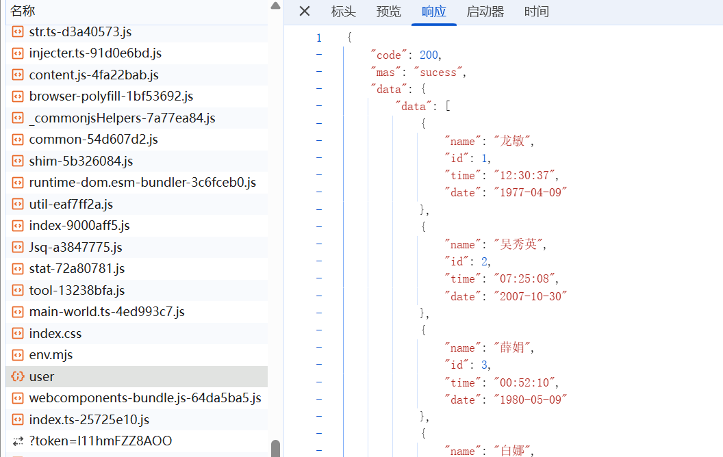 import mockJS from "mockjs"const userList = mockJS.mock({"data|100": [{name: "@cname", // 生成不同的中文名"id|+1": 1, // 生成自增+1的idtime: "@time",date: "@date"}]
