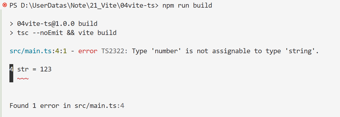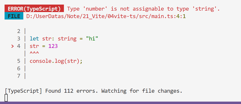 我们将数值类型的值赋值给字符串类型的变量, 在TS中肯定是不合法的, 而且编译器也给出了提示