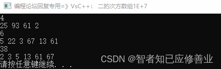 sr1:if (b < c){ std::cin >> a[b], ++b; goto sr1; }n = c; 折扇排序(a, n);n = 数组倍数去重(a, aa, n); b = 0;sc:if (b < n){std::cout << aa[b] << " ", ++b;goto sc; }std::cout << "\n";