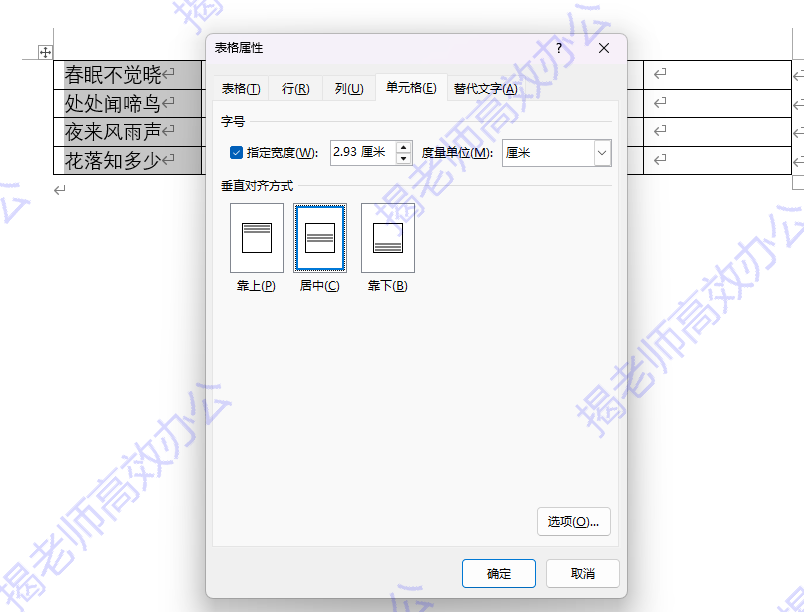 - 使用表格属性设置:首先用鼠标选中需要调整文字垂直居中的单元格或整个表格,然后右击选中的区域,选择 “表格属性” 选项。在弹出的对话框中,切换到 “单元格” 选项卡,在 “垂直对齐方式” 一栏中,点击下拉菜单,选择 “居中” 选项,最后点击 “确定” 即可。如下图所示: