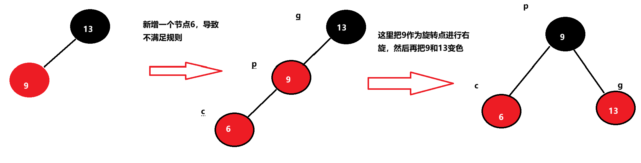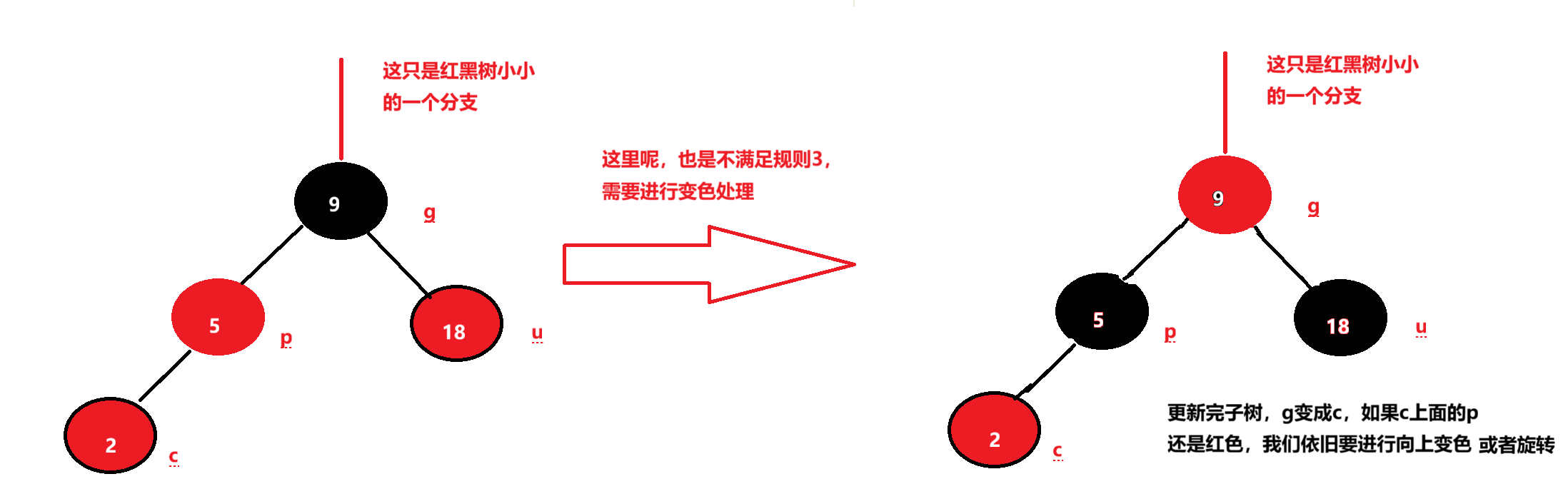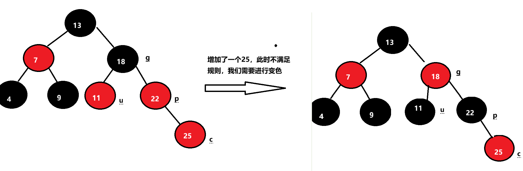 下面情况不满足条件三,所以我们需要把u和p变为黑色,把g变为红色,然后把g当成新的c,继续向上,直到满足所有规则。
