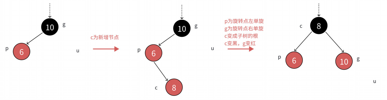 c为红,p为红,g为⿊,u不存在或者u存在且为⿊,u不存在,则c⼀定是新增结点,u存在且为⿊,则 c⼀定不是新增,c之前是⿊⾊的,是在c的⼦树中插⼊,符合情况1,变⾊将c从⿊⾊变成红⾊,更新上来的。(符合下面的情况都按这个规则进行变色加旋转,前提是颜色符合上述)