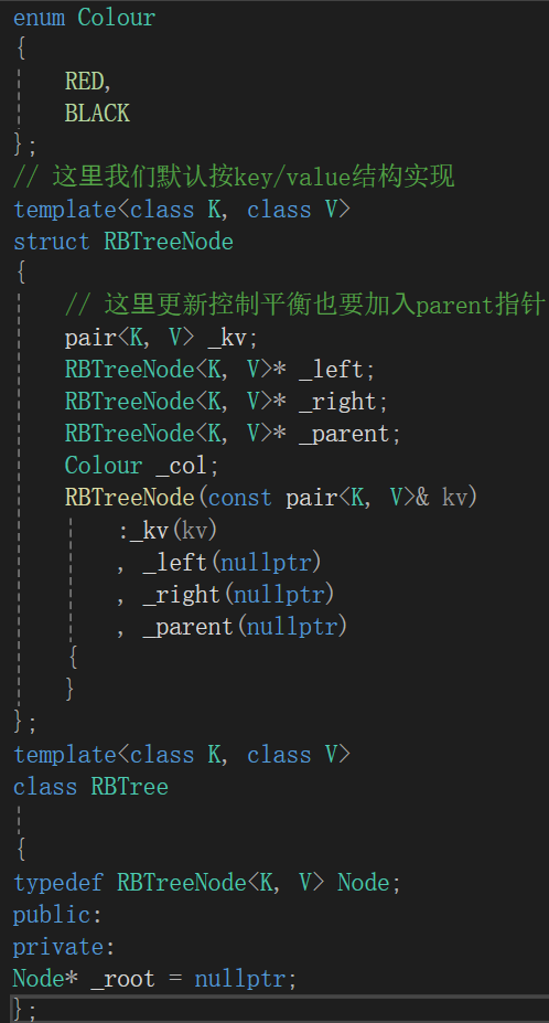 为了更好的了解红黑树的旋转和变色情况,我们先来了解一下红黑树的结构: