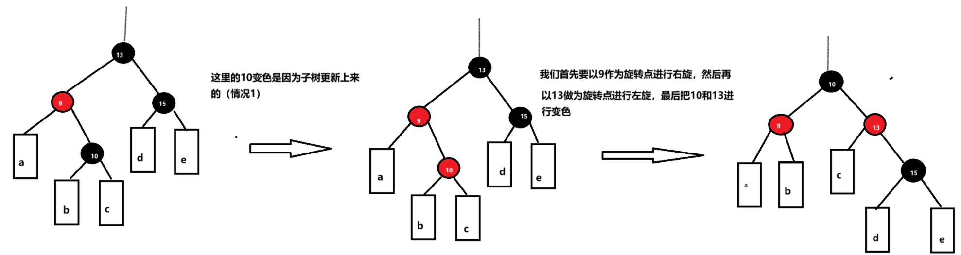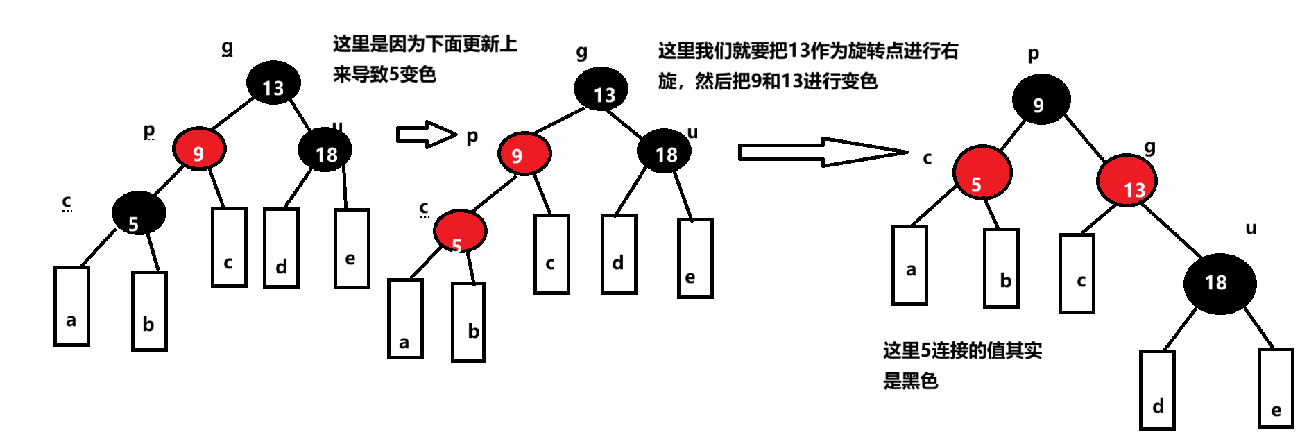 旋转完后c变成课这颗树新的根,这样⼦树⿊⾊结点的数量不变,没有连续的红⾊结点了,且