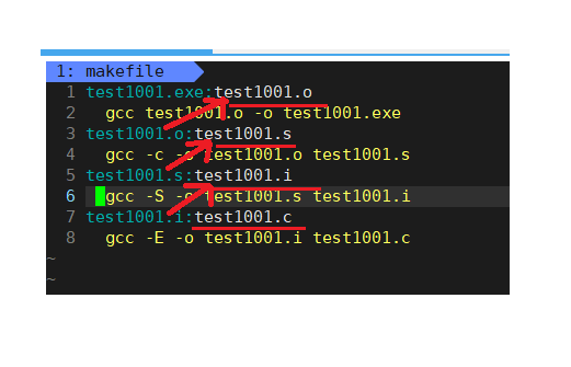 - 比如:如果test1001.exe所依赖的test1001.o不存在,就会找当前文件中目标文件为test1001.o的依赖文件,就这样层层递推,直到最终编译出第一个目标文件。