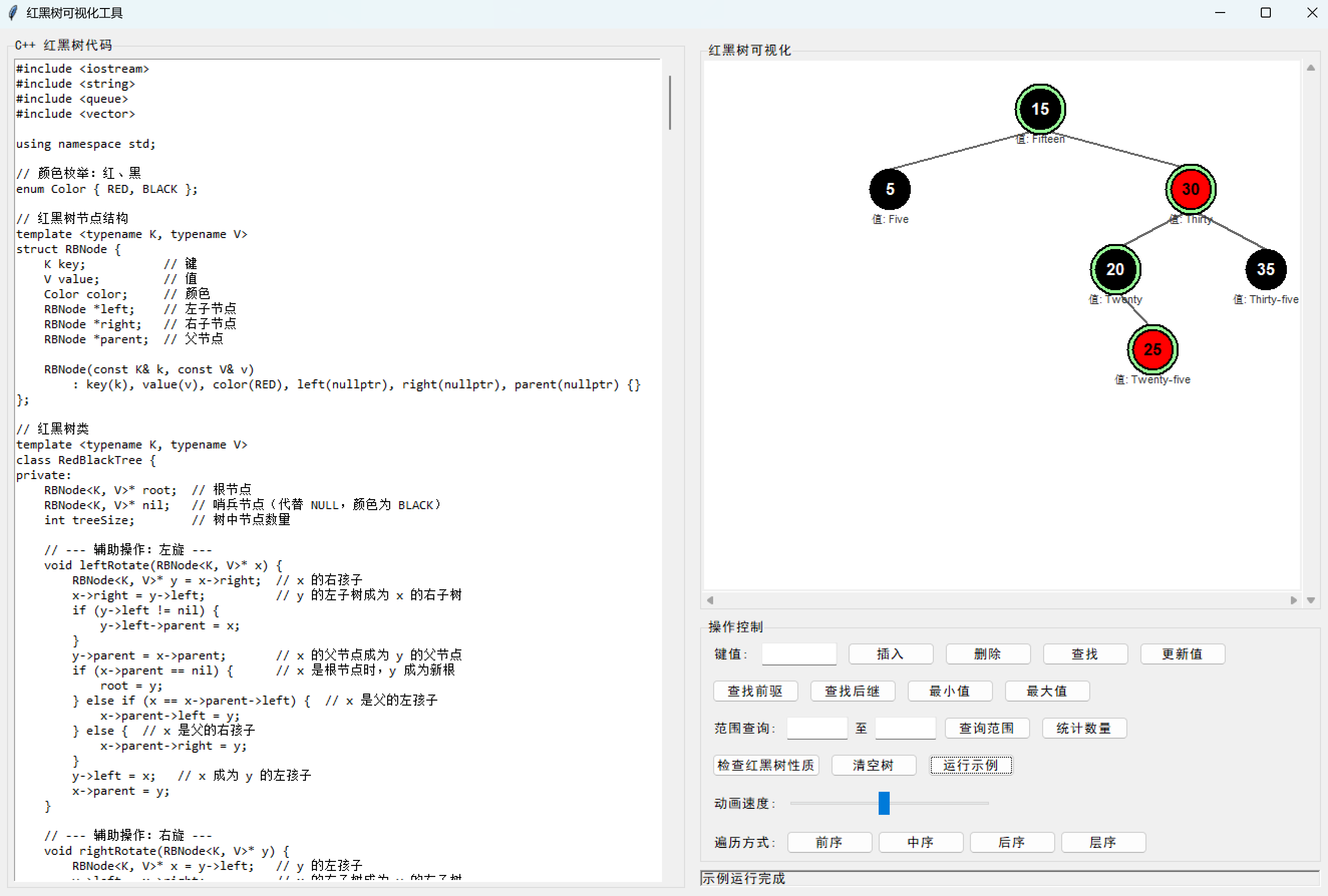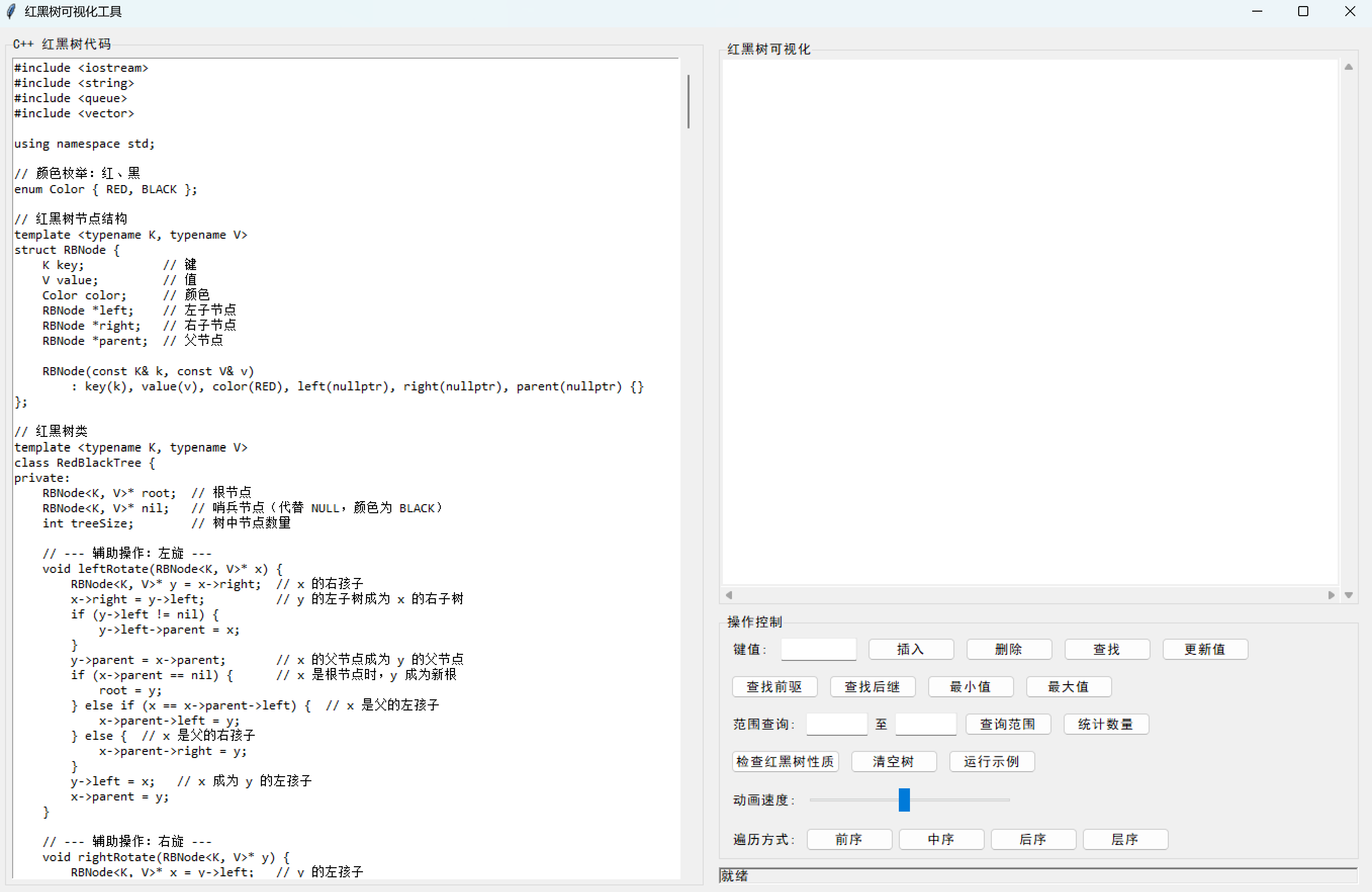 - 教学辅助:内置C++代码对照区、示例演示功能和红黑树性质检查工具,适合数据结构教学;