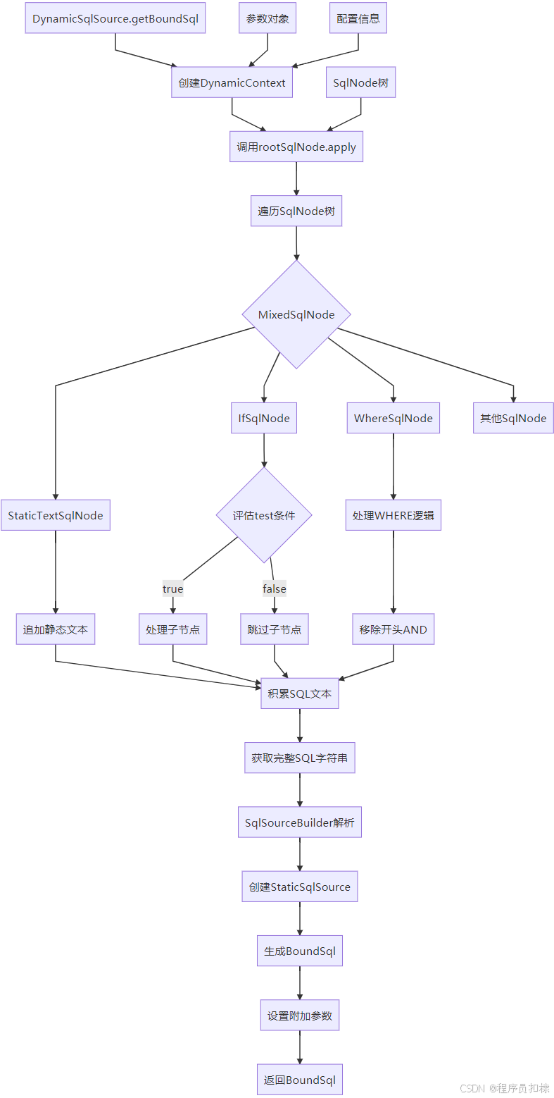 public class DynamicSqlSource implements SqlSource {private final Configuration configuration;private final SqlNode rootSqlNode;@Overridepublic BoundSql getBoundSql(Object parameterObject) {// 步骤1:创建动态上下文DynamicContext context = new DynamicContext(configuration, parameterObject);// 步骤2:应用SqlNode树生成SQLrootSqlNode.apply(context);// 步骤3:解析生成的SQL字符串SqlSourceBuilder sqlSourceParser = new SqlSourceBuilder(configuration);Class<?> parameterType = parameterObject == null ? Object.class : parameterObject.getClass();SqlSource sqlSource = sqlSourceParser.parse(context.getSql(), parameterType, context.getBindings());// 步骤4:获取最终的BoundSqlBoundSql boundSql = sqlSource.getBoundSql(parameterObject);// 步骤5:添加动态参数for (Map.Entry<String, Object> entry : context.getBindings().entrySet()) {boundSql.setAdditionalParameter(entry.getKey(), entry.getValue());}return boundSql;}}