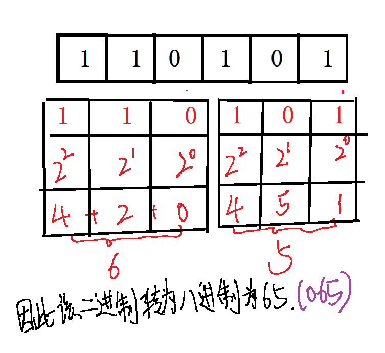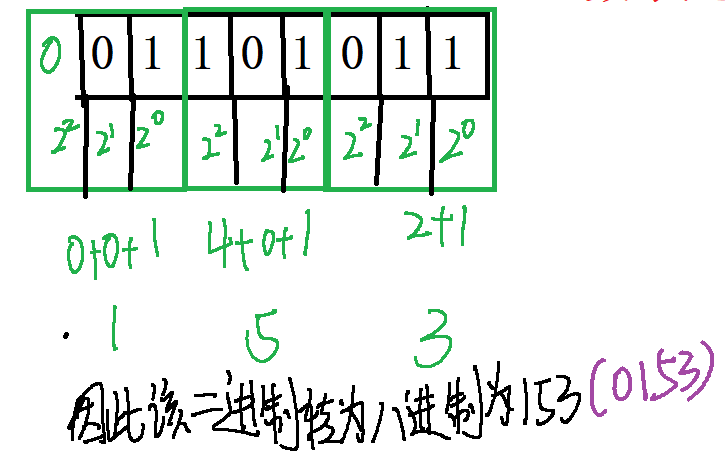 规则:从二进制数的右往左每3位分为一组,不足3位的在左边补零。再将每组对应成一位八进制数(0~7)。