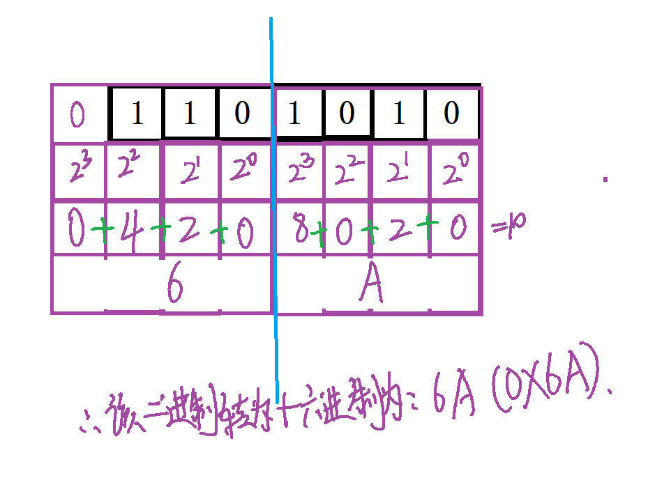规则:从二进制数的右往左每4位分为一组。不足4位的在左边补零,再将每组对应成一位16进制数(0~9,A~F)。