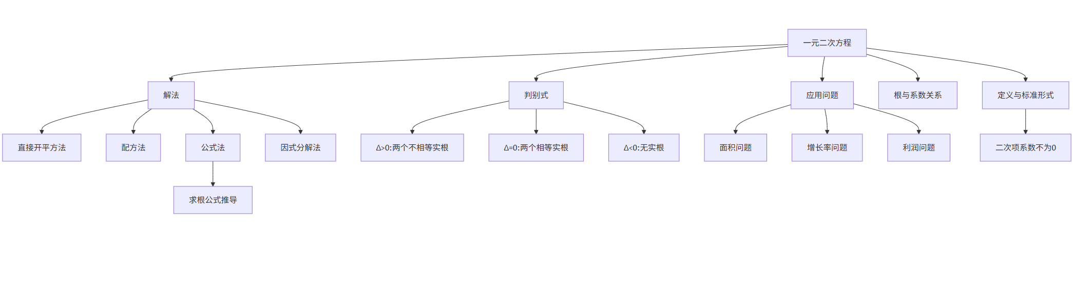 graph TDA[一元二次方程] --> B[定义与标准形式]A --> C[解法]C --> D[直接开平方法]C --> E[配方法]C --> F[公式法]C --> G[因式分解法]A --> H[判别式]H --> I[Δ>0:两个不相等实根]H --> J[Δ=0:两个相等实根]H --> K[Δ<0:无实根]A --> L[根与系数关系]A --> M[应用问题]M --> N[面积问题]M --> O[增长率问题]M --> P[利润问题]B --> Q[二次项系数不为0]F --> R[求根公式推导]