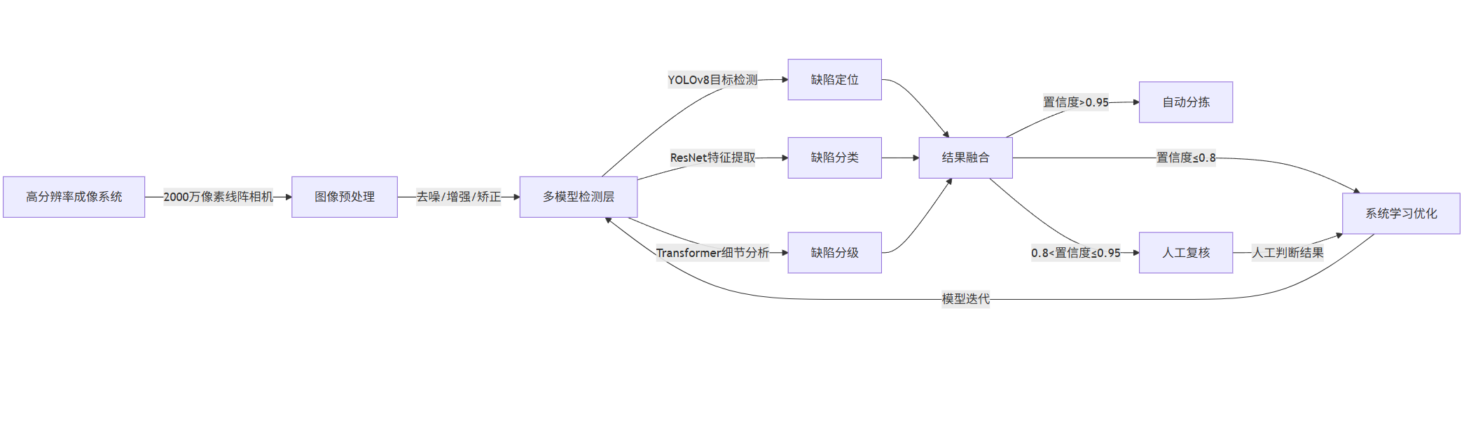 graph LRA[高分辨率成像系统] -->|2000万像素线阵相机| B[图像预处理]B -->|去噪/增强/矫正| C[多模型检测层]C -->|YOLOv8目标检测| D[缺陷定位]C -->|ResNet特征提取| E[缺陷分类]C -->|Transformer细节分析| F[缺陷分级]D --> G[结果融合]E --> GF --> GG -->|置信度>0.95| H[自动分拣]G -->|0.8<置信度≤0.95| I[人工复核]G -->|置信度≤0.8| J[系统学习优化]I -->|人工判断结果| JJ -->|模型迭代| C