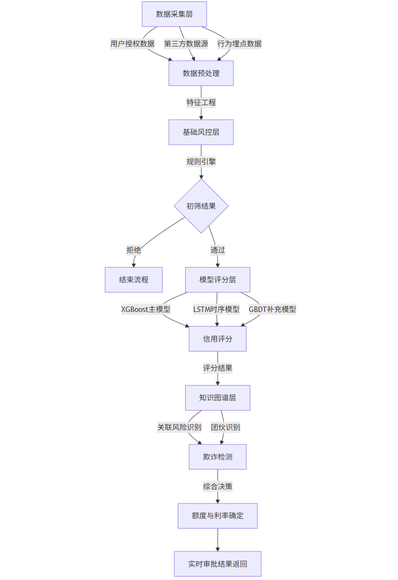 graph TDA[数据采集层] -->|用户授权数据| B[数据预处理]A -->|第三方数据源| BA -->|行为埋点数据| BB -->|特征工程| C[基础风控层]C -->|规则引擎| D{初筛结果}D -->|拒绝| E[结束流程]D -->|通过| F[模型评分层]F -->|XGBoost主模型| G[信用评分]F -->|LSTM时序模型| GF -->|GBDT补充模型| GG -->|评分结果| H[知识图谱层]H -->|关联风险识别| I[欺诈检测]H -->|团伙识别| II -->|综合决策| J[额度与利率确定]J --> K[实时审批结果返回]