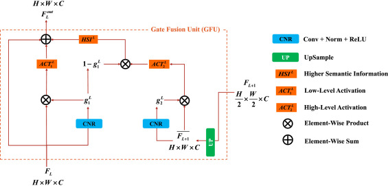 Gate Fusion Unit (GFU) Archite...上图展示了门控融合单元(GFU)的架构,其通过门控机制(gating mechanism)控制低级激活(𝐴𝐶𝑇1𝐿)和高级激活(𝐴𝐶𝑇1𝐻)的贡献,实现特征的有效融合。