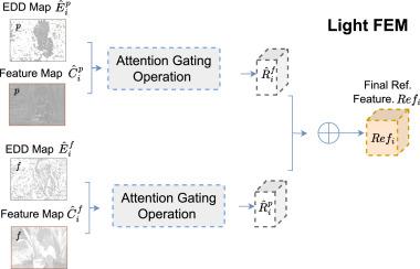 Light FEM diagram上图展示了一个轻量级FEM(Light FEM)架构,其中“注意力门控操作”利用输入的EDD Map和特征图,通过门控机制生成精炼的特征图,最终实现特征的融合。