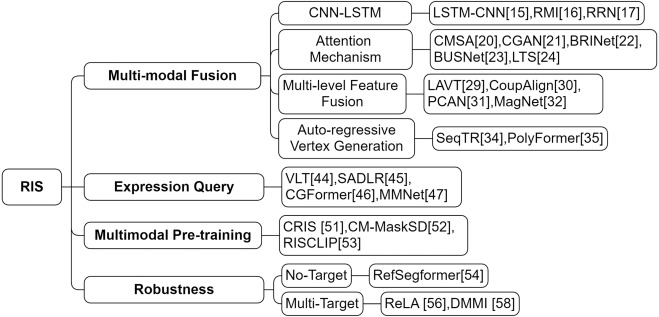 RIS Overview上图展示了多模态融合方法的一个分支——注意力机制,其中包含了CMSA、CGAN等模型,这些模型在RIS(Referring Image Segmentation)任务中利用注意力机制实现多模态信息的有效融合。