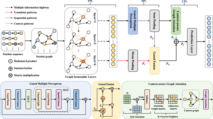 Neural network architecture wi...上图展示了一个结合门控和注意力机制的图神经网络架构,用于会话推荐,其中门控多层感知机(GMP)和门控融合操作在融合全局和局部特征中扮演重要角色。