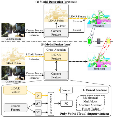 Overview of Multimodal Adaptiv...上图对比了模态装饰与模态融合两种传感器数据融合方法,其中模态融合(ours)部分明确指出了“交叉注意力”机制在LiDAR特征与相机特征交换信息中的核心作用。