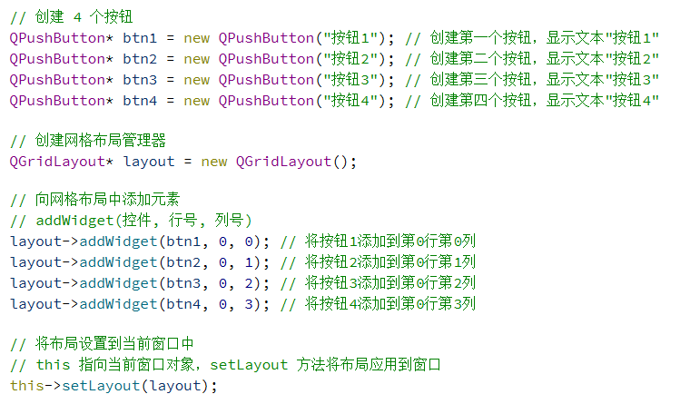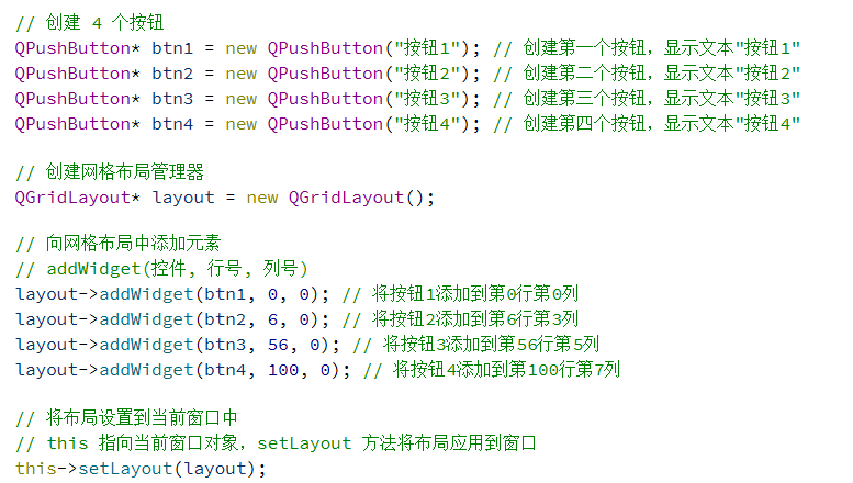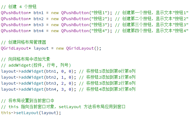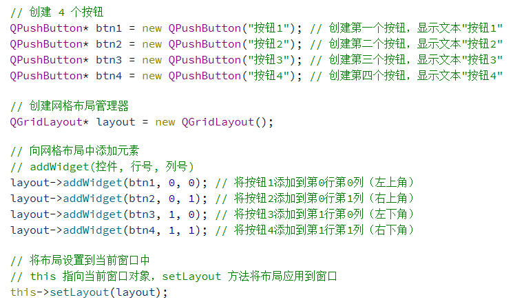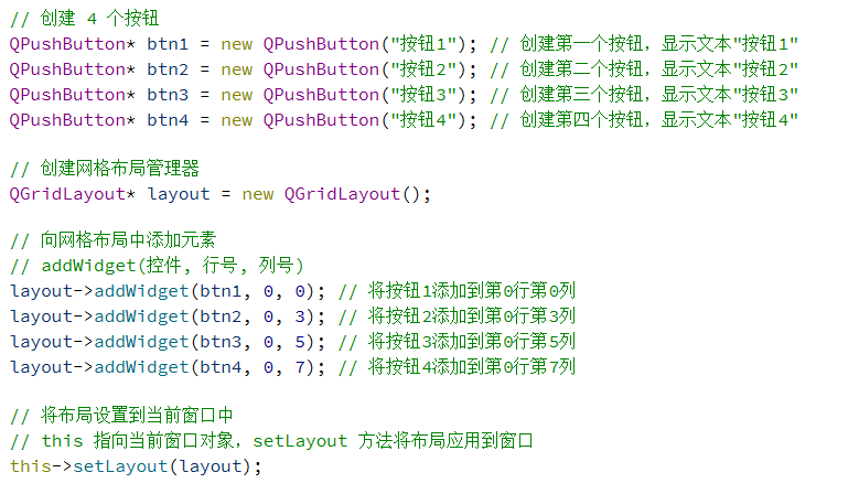 总的来说,使用 QGridLayout 能够代替很多 QHBoxLayout 和 QVBoxLayout 嵌套的场景.毕竟嵌套的代码写起来是比较麻烦的.