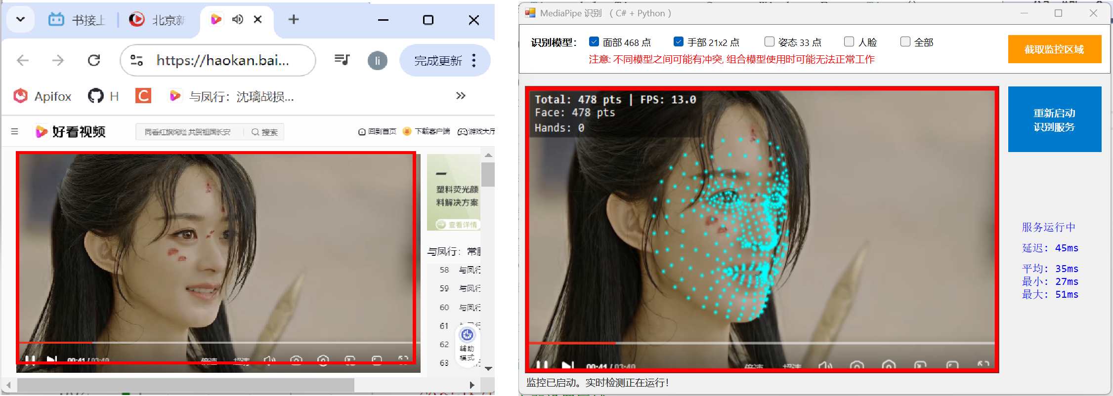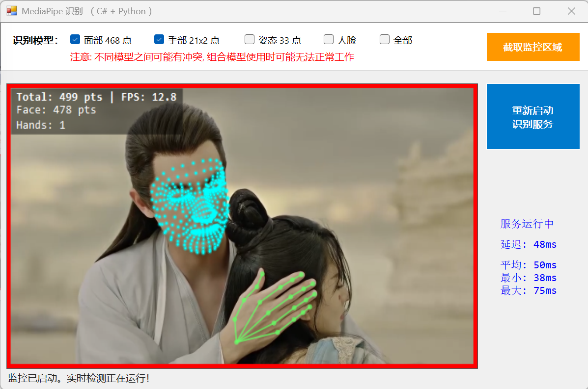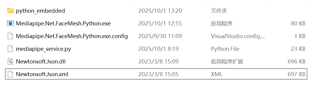 我尝试使用 MediaPipe.NET 来进行人脸468点的 功能实现,但是遇到了各种问题,MediaPipe.NET 对 vector<NormalizedLandmarkList>类型的支持有限,导致加载模型后也没能成功识别,遇到的问题有点多,因此没再继续尝试,更换了思路,直接把 Python 嵌入到软件目录下来进行完全隔离的调用,因此以Python的识别作为服务,来进行数据交换的识别,统一封装在一个软件中,通过一个按钮来 一键启动,进行实时识别。该演示进行了这种使用方式的尝试。