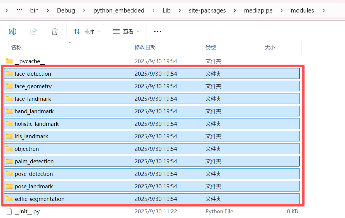 python_embedded 这个目录是嵌入的python完整环境的目录,同时里面也包含了MediaPipe的相关依赖。MediaPipe 包含的模型分类有:face_detection、face_geometry、face_landmark、hand_landmark、holistic_landmark、iris_landmark、palm_detection、pose_detection、pose_landmark、selfie_segmentation,如下图: