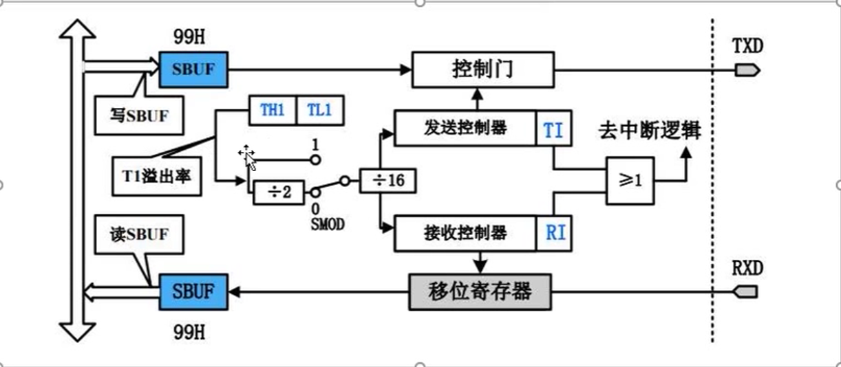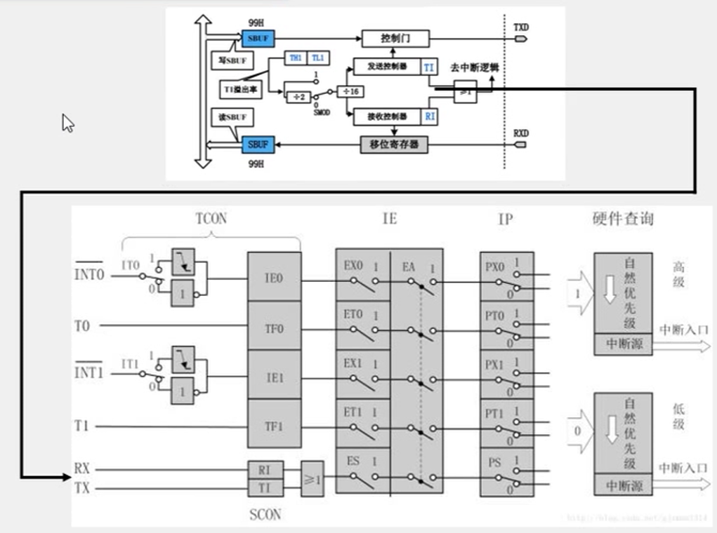 上图为串口通信的过程,发送和接受的数据都存储在SBUF中,通过定时器1来设置波特率,并可以通过串口中断来判断接受(RI)和发送(TI)数据。下图为中断的内部配置。