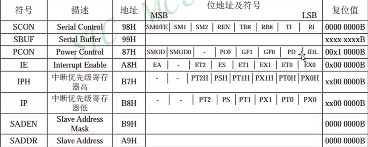 下图为与串口有关的寄存器,在串口初始化中,只需要对串口的模式,定时器1,中断的配置即可。
