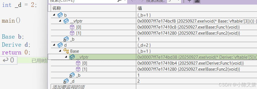 通过调试时我们发现似乎有些问题,理论上派生类d,应该会有三个虚函数(继承基类的两个,新增加的两个),但是我们发现虚表中只有两个指针,我们看不到Func3()和Func4(),这里是编译器隐藏了这两个函数,可以认为是VS的一个Bug。