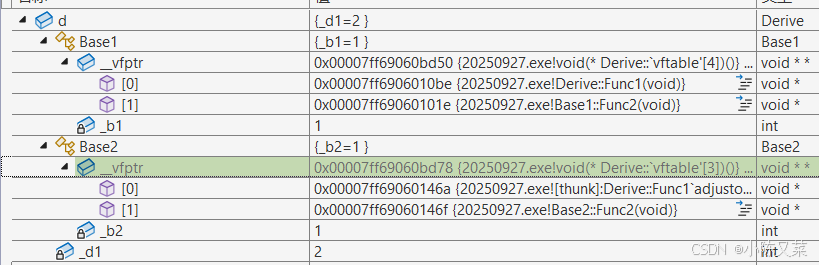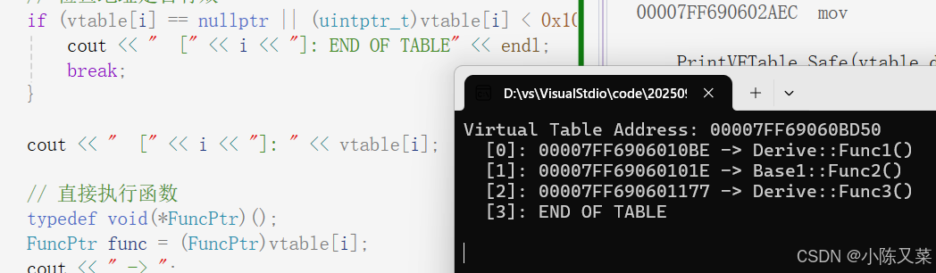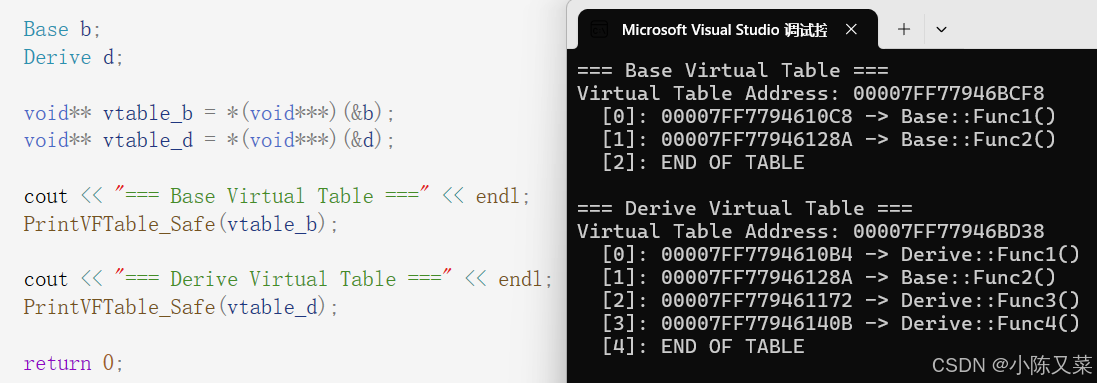 {Base b;Derive d;void** vtable_b = *(void***)(&b);void** vtable_d = *(void***)(&d);cout << "=== Base Virtual Table ===" << endl;PrintVFTable_Safe(vtable_b);cout << "=== Derive Virtual Table ===" << endl;PrintVFTable_Safe(vtable_d);return 0;