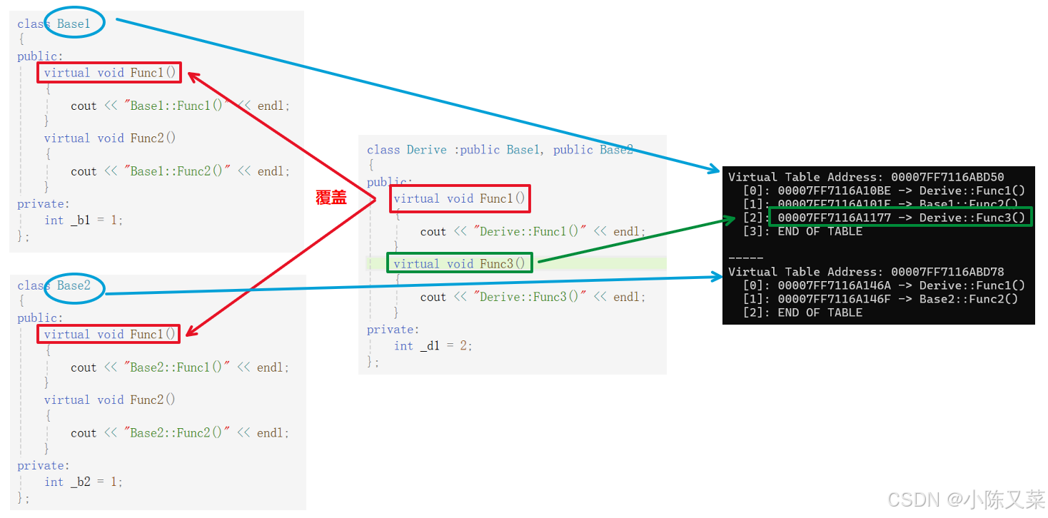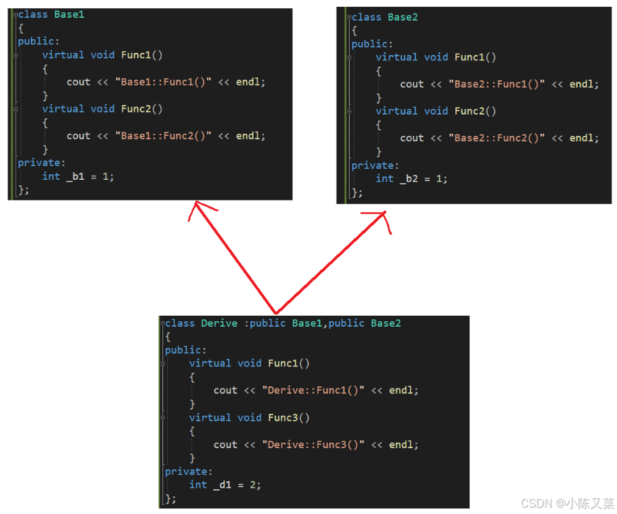 public:virtual void Func1(){cout << "Base2::Func1()" << endl;}virtual void Func2(){cout << "Base2::Func2()" << endl;}
