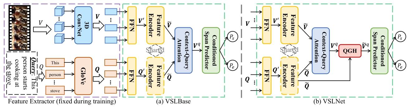 作为标准跨度 QA 框架在 NLVL 的适配版本,VSLBase 包含三大核心模块,实现 “视频 - 查询交互→边界预测” 的完整流程: