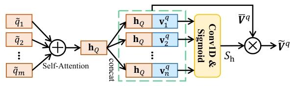 QGH 更核心的是 “查询引导的前景定位与特征增强”:文档指出,QGH 是 “基于查询语义的高亮策略”—— 首先通过自注意力将查询特征编码为句子级表示\(h_Q\)(捕捉查询整体语义),再将\(h_Q\)与视频特征拼接,通过 1D 卷积和 Sigmoid 生成 “高亮分数\(S_h\)”(预测每个视频特征属于前景的置信度),最终用\(S_h\)对视频特征加权,得到 “高亮特征\(\tilde{V}^q\)”。这一步的核心是让 “前景扩展” 的区域与查询语义强关联,避免无差别增大上下文(若仅增大上下文而无查询引导,可能引入无关背景噪声),对应解决 “视频 - 文本感知敏感度差异”(引导模型聚焦前景内的细微差异)。