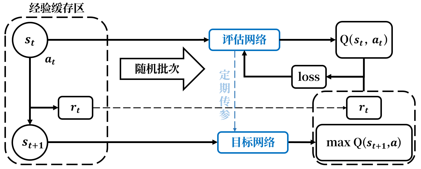 目标网络和评估网络将动作评估与标签计算的过程解耦。其中评估网络负责控制智能体,收集经验;目标网络用于计算标签yt=rt+γ⋅maxaQ(st+1,a;θ−)y_t=r_t+\gamma\cdot\max_aQ(s_{t+1},a;\theta^-)yt=rt+γ⋅maxaQ(st+1,a;θ−)。在每一批更新中,只有评估网络的权重θ\thetaθ会得到持续的更新,目标网络的权重θ−\theta^-θ−保持不变以稳定训练目标。评估网络更新一定次数后,其权重更新结果才会复制给目标网络,让目标网络也能得到更新,随后进行下一批更新。