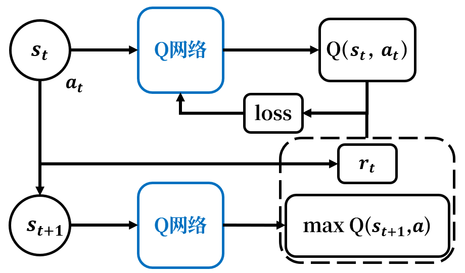 - 将状态st+1s_{t+1}st+1输入Q网络,从输出中选择最优动作价值maxaQ(st+1,a;θ)\max_aQ(s_{t+1},a;\theta)maxaQ(st+1,a;θ);