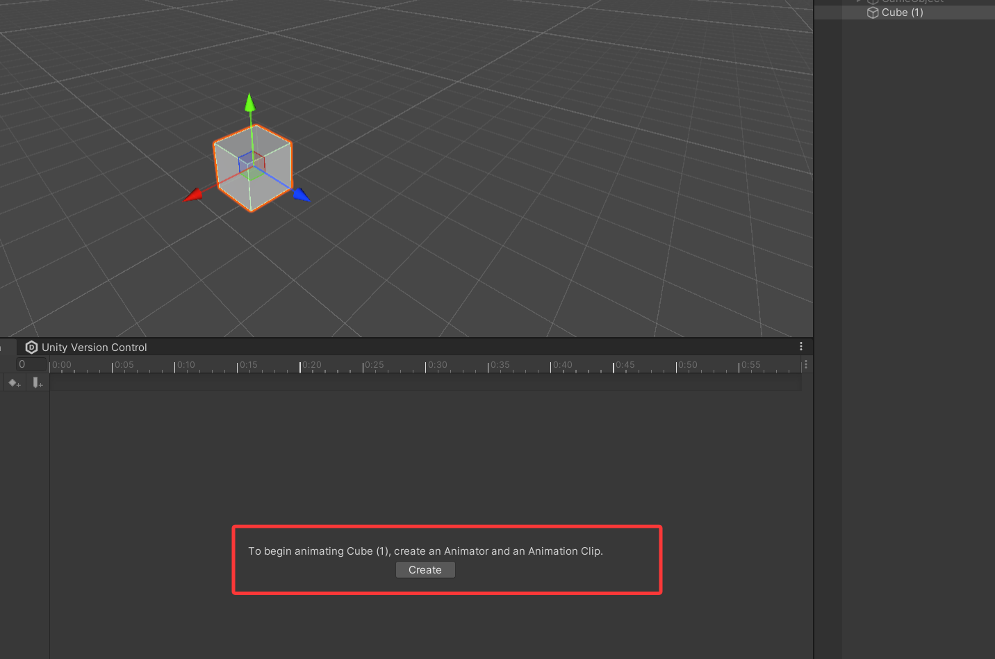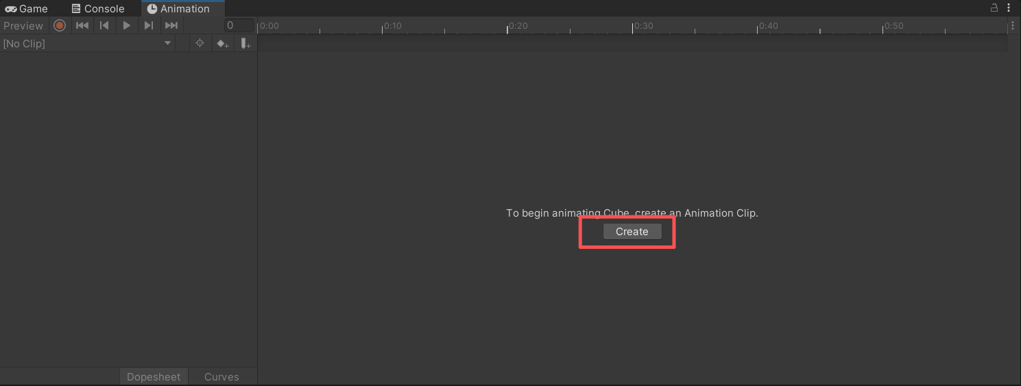 在上方栏Window—>Animation—>Animation打开动画窗口,并将其拖至Game界面。选择你创建的立方体Cube,即可点击Create为其创建动画: