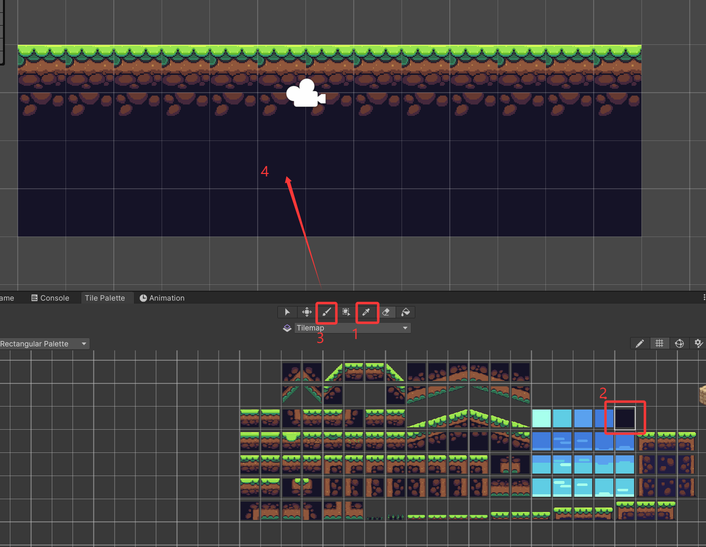 选择对应瓦片进行吸色,切换画笔,即可直接在场景(方形瓦片地图)中进行简单的场景绘制: