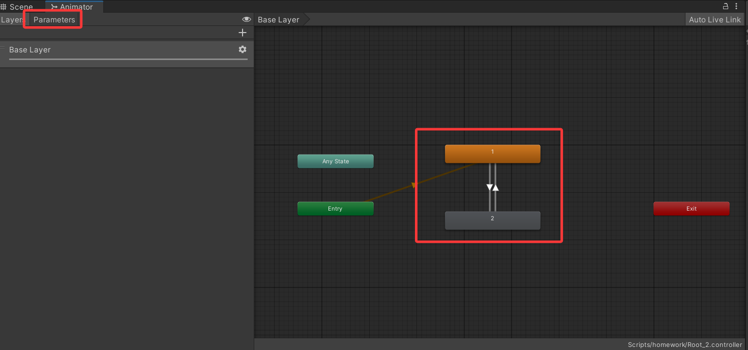 创建多个动画后,Window—>Animation—>Animator中可以编辑动画播放顺序、播放条件等。其中,绿色的方块代表进入动作,红色为退出。黄色是默认动作,可以进行更换。灰色的是其他动作。在对应方块上右键—>Make Transtion,并点击想要切换的动作,即可创建图中红框所示箭头。这里创建了两个。