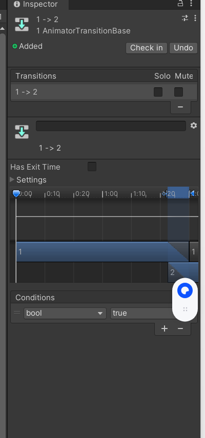 点击想要设置参数的箭头,就可以进行动作切换条件设置。取消勾选Has Exit Time可以让动作切换更加迅速。在Conditions处点击加号,可以添加切换条件,这里设置为,当bool为true时,从动作1切换到动作2。