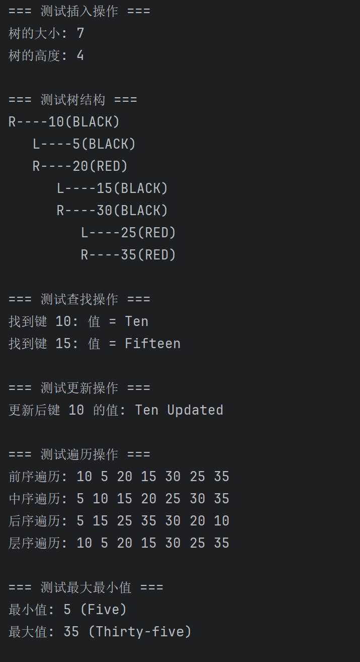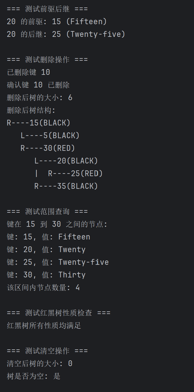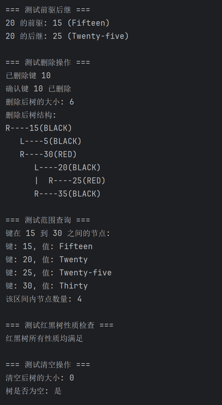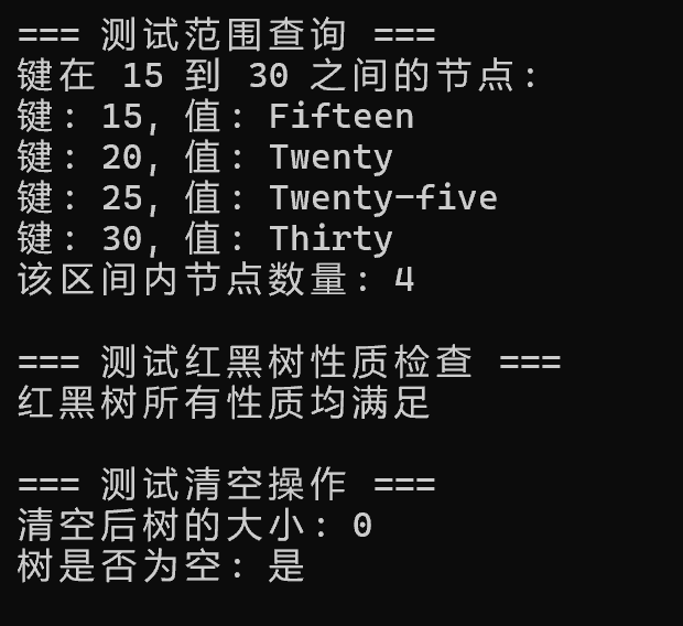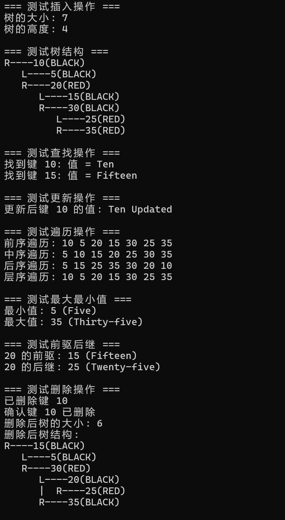 调试建议:在开发阶段,可在每次插入、删除操作后调用 checkProperties 函数,若触发断言则定位问题节点。例如,当 checkRedParentProperty 检测到连续红节点时,可通过打印节点路径(如 x->parent->value -> x->value)快速定位违规节点,回溯操作日志排查颜色更新或旋转逻辑错误。