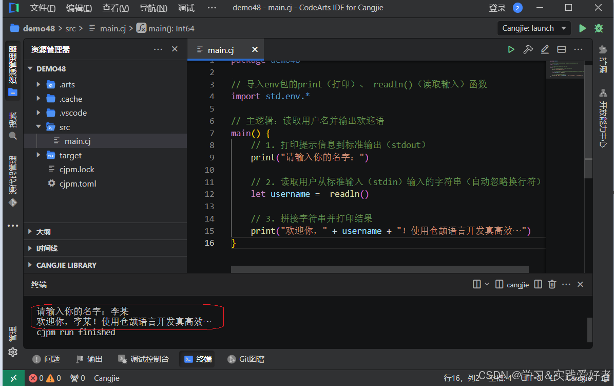 main() {// 1. 打印提示信息到标准输出(stdout)print("请输入你的名字:")// 2. 读取用户从标准输入(stdin)输入的字符串(自动忽略换行符)let username = readln()// 3. 拼接字符串并打印结果print("欢迎你," + username + "!使用仓颉语言开发真高效~")
