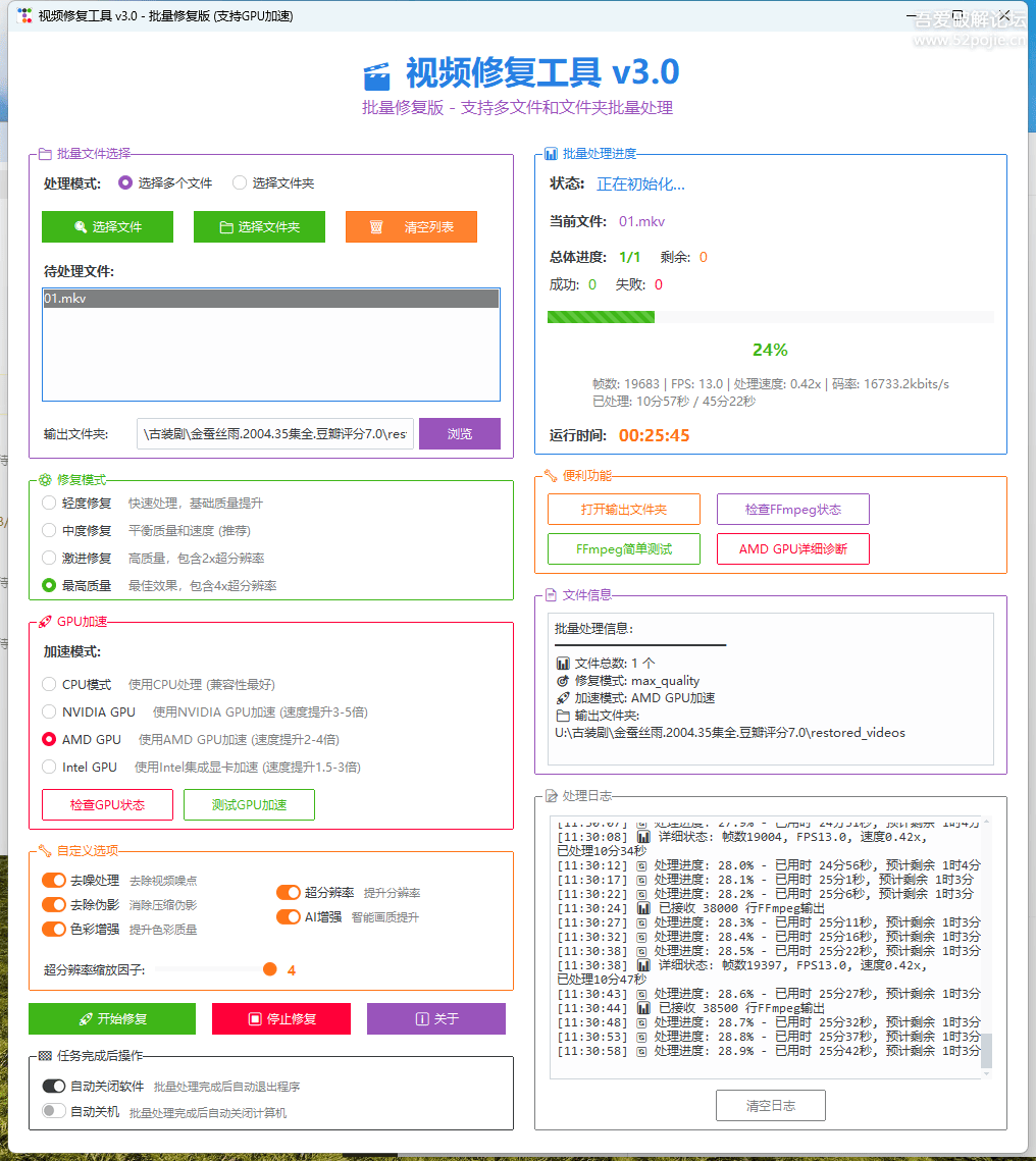 支持文件修复和多个文件修复也支持单个文件,支持选择修复质量。