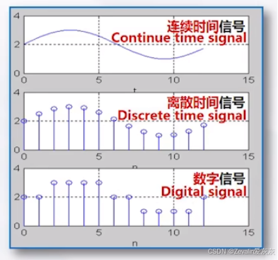 ②离散时间信号:只在离散的时间点有确定的值,通常是对连续信号进行采样得到的。