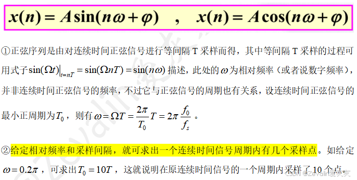 (1)离散时间信号(又称序列)是连续时间信号以时间T等间隔采样得到的,T称为采样周期或采样间隔。